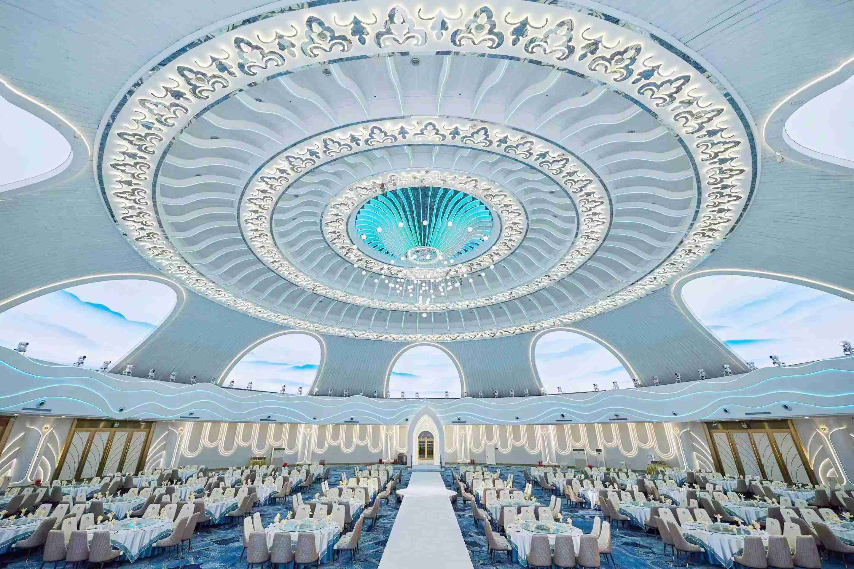 女神會展店經營面積7000平米,十四個蒙元主題豪華包房大氣磅礴、匠心獨具,打造內蒙古蒙元主題餐飲第一店,三個宴會廳氣勢如虹、奢華之至,為頂級蒙式風格婚禮殿堂。其中可容納1000人敖包相會宴會廳層高18米,面積2200平米,無柱的超大蒙古包造成,是時尚新蒙風的代表廳堂。